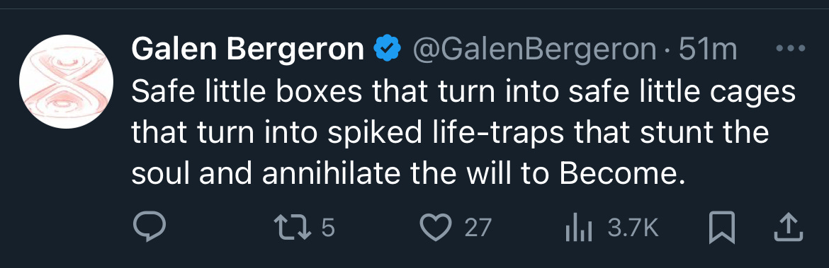 His response made me laugh, I’ll admit. But I think in order to participate in universalism, you need to have some benevolence first. Caring for a sum but not its parts makes no sense to me, and just screams avoidance. Like, of course you love the vague concept of humanity. Everyone does. It requires no risk or vulnerability.